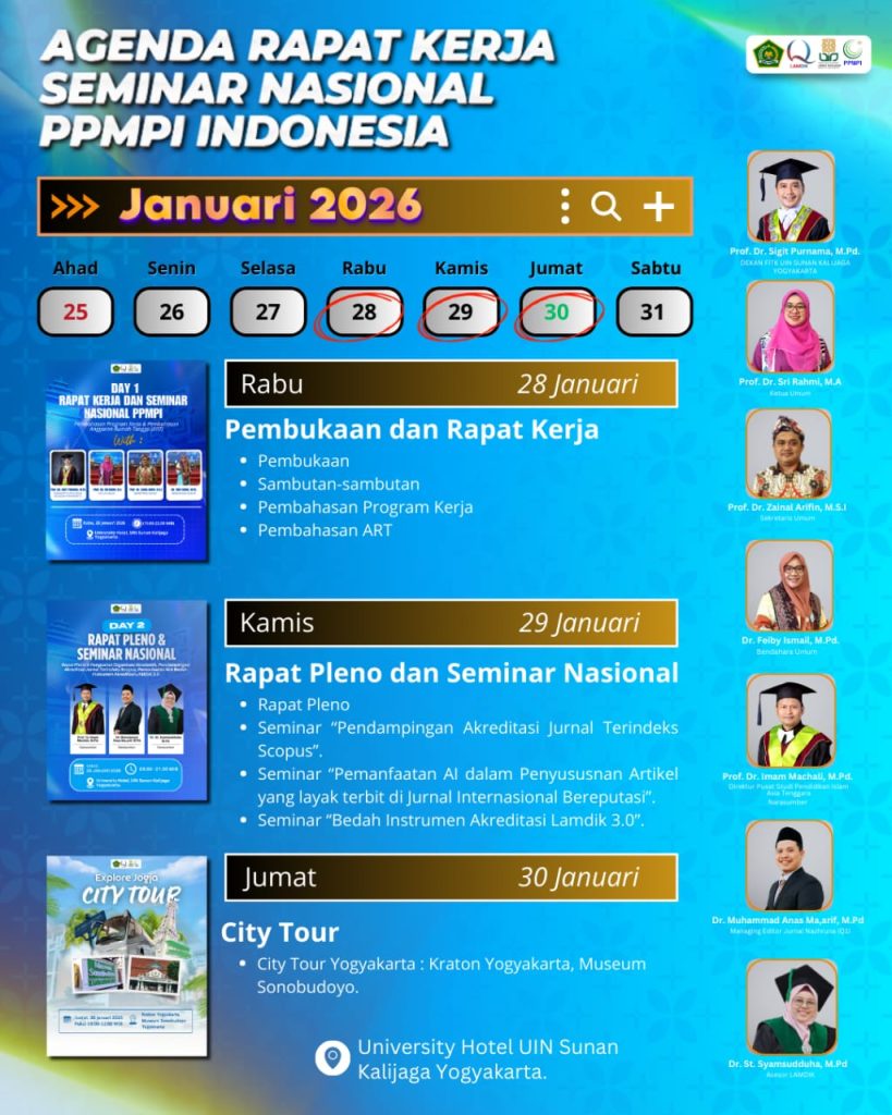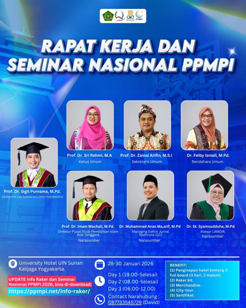 InsyaAllah, PPMPI akan menyelenggarakan Rapat Kerja Pengurus PPMPI Periode 2025-2029 dan Seminar Nasional 2026 pada hari Rabu, 28 sampai Jumat, 30 Januari 2026 di University Hotel UIN Sunan Kalijaga dengan tema: “Sinergi dalam Pengembangan Kompetensi Dosen dan Publikasi Ilmiah“.
